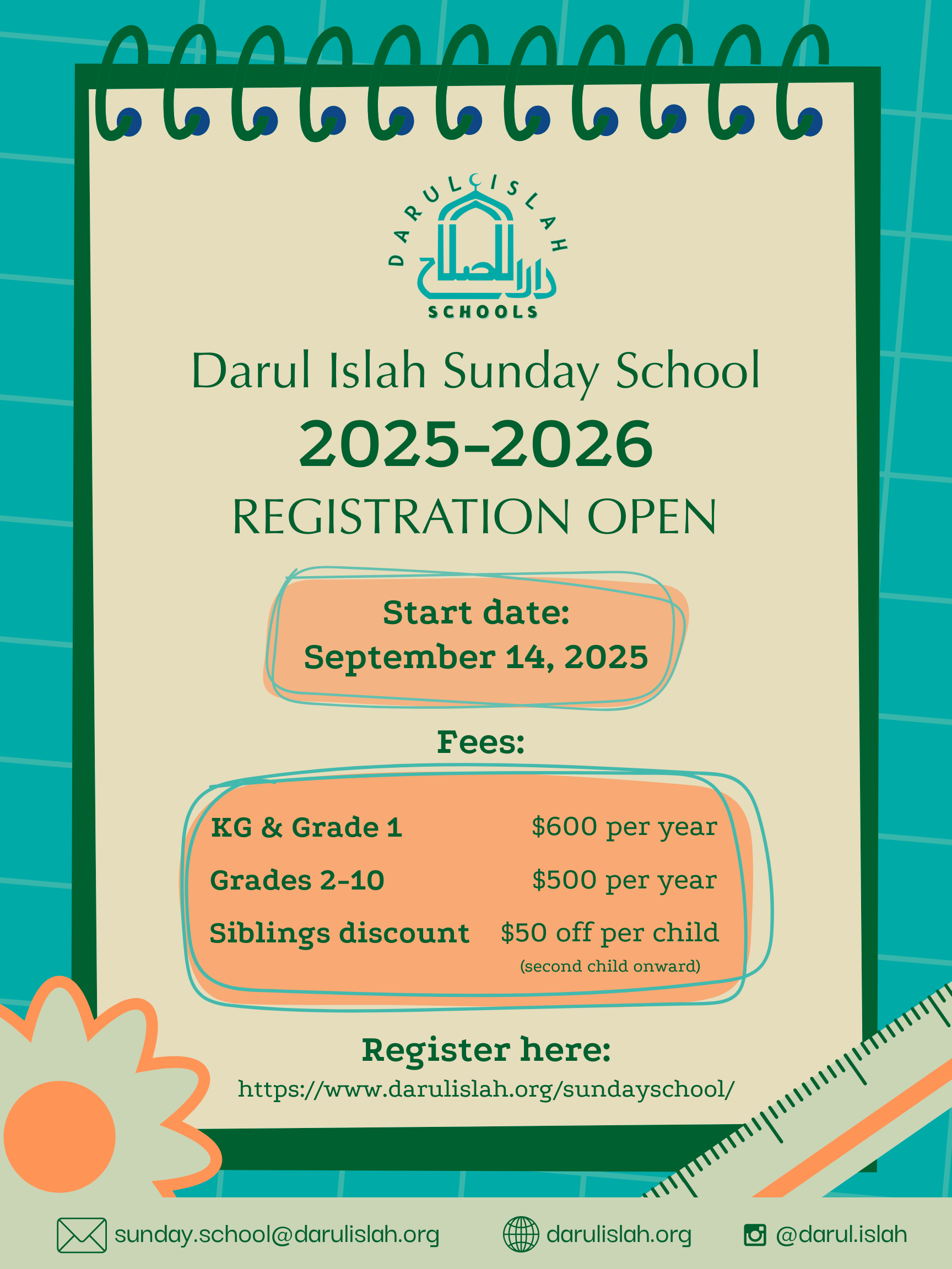 For questions regarding Sunday School, please contact the office during M-F (10 am – 4 pm) at 201-692-7730 ext 1 or email at sunday.school@darulislah.org